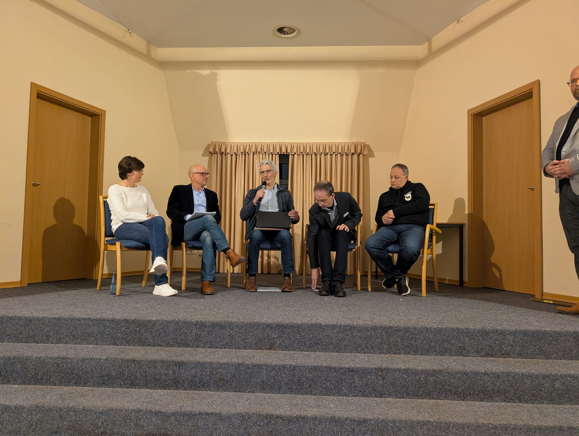 Nach den Einzelvorträgen kamen alle Beteiligten auf dem Podium zusammen. In einer engagierten Diskussionsrunde wurden nicht nur Fragen unter den Referenten geklärt, sondern vor allem das Wort an die Versammlung übergeben. Die Stimmung im Saal war zwar von einer kritischen Grundhaltung gegenüber der Energiewende und der externen Steuerung der Planungen geprägt, blieb jedoch zu jedem Zeitpunkt sachlich und respektvoll.